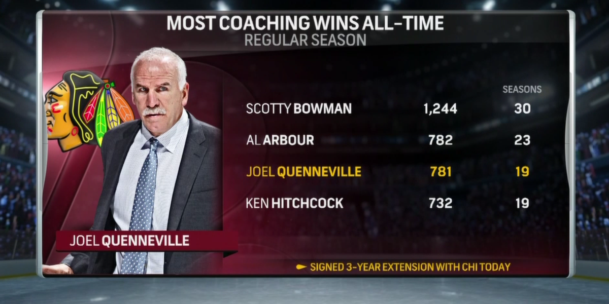 Joel Quenneville podpisał nowy trzyletni kontrakt z Chicago Blackhawks i uczcił to osiągnięciem 782. ligowej wygranej. Czarne Jastrzębie ograły 3:2 Nashville Predators, a Quenneville zrównał się pod względem triumfów z Alem Arbourem na drugiej lokacie trenerskiego zestawienia wszech czasów. Przed wymienioną dwójką znajduje się jeszcze Scotty Bowman, którego dorobek będzie bardzo ciężki do pobicia (1244 zwycięstwa).