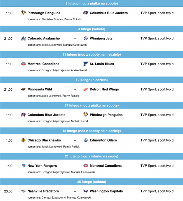 Hej komentuje dzisiejszy mecz Penguins-Columbus ktoś od was na tvp sport? Nieźle się zapowiada. Jest piątek to można na żywca w nocy pooglądać. Może też coś wiecie czy tvp może jakoś więcej będzie pokazywać meczy chociaż co drugi dzień bo codziennie to chyba nie za naszego życia. Tak pytam bo macie z nimi kontakt to może coś więcej wiecie.