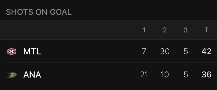 Co by nie mówić dominacja Anaheim w pierwszych 20 minutach znalazła odzwierciedlenie w wyniku. Druga tercja była.. no właśnie, czym? Fani Canadiens mogli mieć pierwszy powód do radości w tym miesiącu. Montreal zagrał najlepszą tercję nie tylko w sezonie, ale i… całej swojej historii! 30 oddanych strzałów na bramkę Gibsona to rekord wszech czasów – poprzedni wynosił 27.