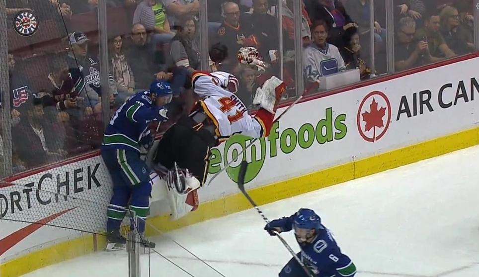 Nie zaprzątając sobie szczególnie głowy drużynami, które nie mają już szansy na awans do play-off, trzeba pochwalić Canadiens za zdobycie siedmiu goli z Sabres. Wcale mnie to nie dziwi bo obrona Szabel to szambo, a przy okazji Buffalo straciło matematyczne szansę na play-offy, dziękujemy do widzenia. Flames wygrali z Canucks czemu towarzyszyła twarda gra z obu stron, po jednej z akcji w 3T w powietrze wysadzony został nawet Mike Smith bramkarz Calgary uderzony mocno ciałem przez Alexa Edlera (foto u góry)