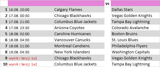- I tercja: Chicago Blackhawks – Vegas Golden Knights