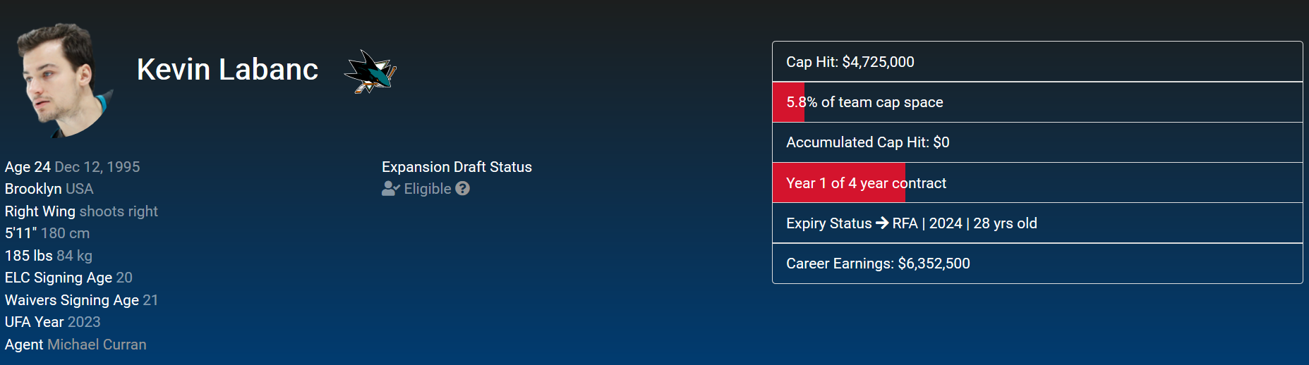 Owszem, patrząc na dokonania indywidualne, Labanc wykonał zauważalny krok w tył. Bramkowy dorobek był na porównywalnym poziomie, ale liczba zanotowanych asyst zmniejszyła się ponad dwukrotnie. Sharks grali słabo, postawa skrzydłowego z Brooklynu też pozostawiała sporo do życzenia. Można by nawet uśmiechnąć się i powiedzieć, że jego forma odpowiadała wysokości kontraktu, jaki zawarł z Rekinami. Z drugiej strony, po zmianach kadrowych w ekipie z Kalifornii jego rola miała stale wzrastać. W swoich pierwszych sezonach w lidze grywał po ok. 14 minut średnio w każdym meczu, w minionej kampanii ta liczba wzrosła i zaczęła oscylować wokół poziomu 16 minut, przy zachowaniu dotychczasowego czasu przebywania na lodzie w trakcie gier w przewadze. Przełożyło się to m.in. na liczbę oddanych celnych strzałów, ale nie spowodowało, by choć w części dorównać zdobyczom punktowym w PP.