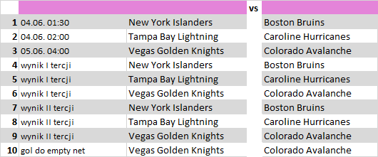 - wynik I tercji: NY Islanders – Boston (1×2, OU 1.5)