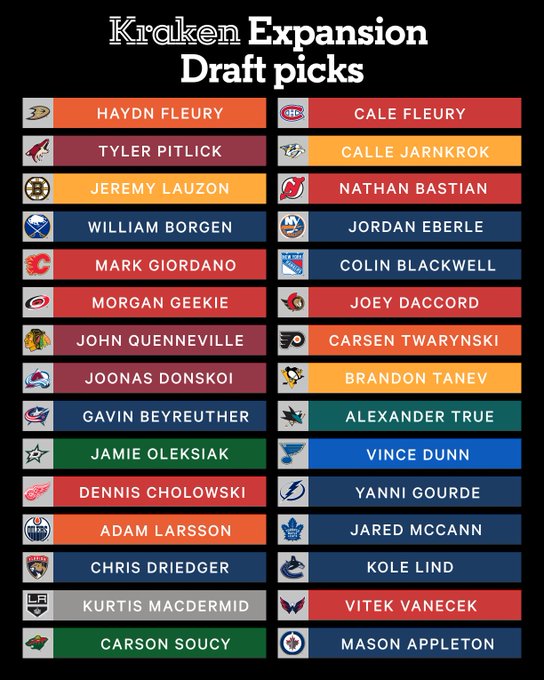 Do godziny 16 polskiego czasu Seattle Kraken mieli czas na przesłanie do NHL listy ze swoimi wyborami w drafcie poszerzającym ligę o ich obecność. W nocy o 2 zaprezentowali swoich hokeistów na specjalnej konferencji prasowej. W międzyczasie czujni reporterzy dzięki swoimi informatorom odgadnęli już zdecydowaną większość wyborów Krakena i osób nim zarządzających. Podajemy wam pełną listę (na tę chwile) wraz z charakterystyką wyselekcjonowanych graczy:
