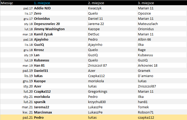 Pedro ponadto wygrywa klasyfikację w miesiącu październik z dorobkiem 38 oczek przed luKasem oraz czapka112.