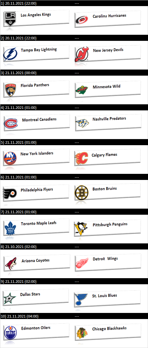 Los Angeles Kings-Carolina Hurricanes 2U Tampa Bay – New Jersey Devils 1 O. Florida Panthers -. Minnesota Wild- 1 O. Montreal Canadiens – Nashville Predators 2U.New York Islanders – Calgary Flames 2 O. Philadelphia Flyers – Boston Bruins XO( joker 3-3). Toronto Maple Leafs- Pittsburgh Penguins X O. Arizona Coyotes- Detroit Red Wings 2 O Dallas Stars-St.louis Blues 2 U. Edmonton Oilers – Chicago Blackhawks 1 O