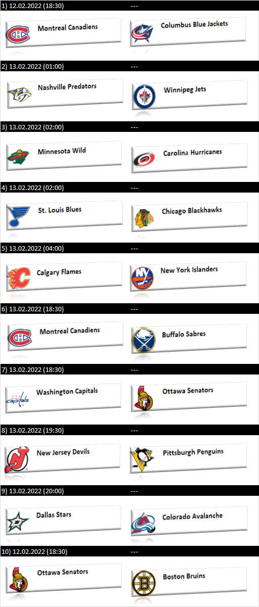 28. Montreal Canadiens -Columbus Blue Jackets 2 O Nashville Predators -Winnipeg Jets- 1 U Minnesota Wild- Carolina Hurricanes X O. (Joker 3-3)St.Louis Chicago Blackhawks X O. Calgary Flames – NY Islanders 1 O. Montreal Canadiens – Buffalo Sabres 2 O. Washington Capitals -Ottawa Senators 1 U New Jersey Devils – Pittsburgh Penguins 2 U. Dallas Stars – Colorado Avalanche- 2 O. Ottawa Senators- Boston Bruins 2U
