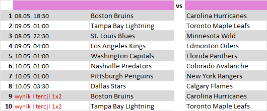 - wynik I tercji: Boston Bruins – Carolina Hurricanes