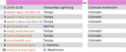 - wynik II tercji (OU 2.5) Tampa – Colorado