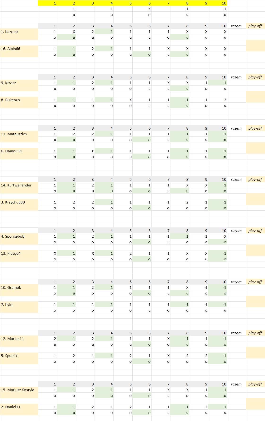 Zgodnie z punktem regulaminu swoje typy w fazie play-off wysyłamy na adres e.mail kzyzak @ hotmail com – nie składamy typów w komentarzu jak miało to miejsce w fazie zasadniczej. W ten sposób unikamy skopiowania identycznych typów swojego rywala, zmieniając taktycznie jedno spotkanie – owe miejsca miały we wcześniejszych play-off w już praktycznie rozstrzygniętych spotkaniach.