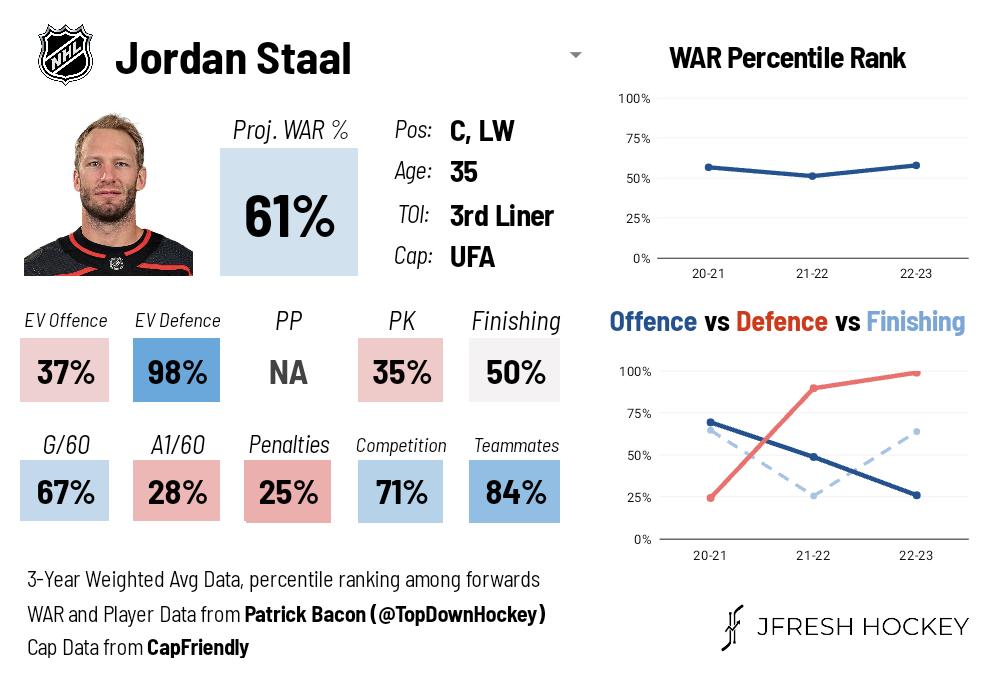 Żeby była jasność – nawet mimo tych 34 lat Jordan Staal to nadal dobry center 3. formacji. Wystarczy rzucić okiem na zaawansowane statystyki, żeby utwierdzić się w przekonaniu, że nadal jest jednym z najlepszych defensywnych centrów w lidze.