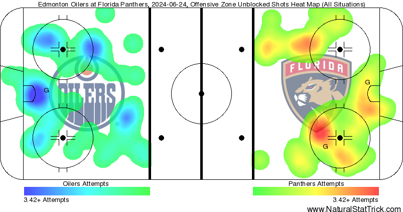 Oilers ponownie bardzo dobrze odsunęli Panthers od bramki, dopuszczając zaledwie jeden strzał z siedmiu sytuacji typu high danger, który jednak znalazł drogę do bramki. Dodatkowo Panthers byli najgroźniejsi z lewego koła bulikowego (patrząc z perspektywy Skinnera), skąd padł game winning goal Reinharta.