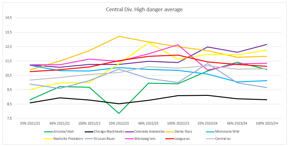 Corsi Central jest słabsza w ofensywie niż wcześniej omawiane dywizje wschodnie. W corsi różnica jest najmniejsza, ale wciąż zauważalna. Jedynie Avalanche i Stars są zawsze powyżej średniej ligowej, periodycznie również Wild, Preds i Jets, głównie w sezonach, w których notowali awanse do PO, w pozostałych fluktuując pomiędzy średnią ligową a niższą, dywizyjną.