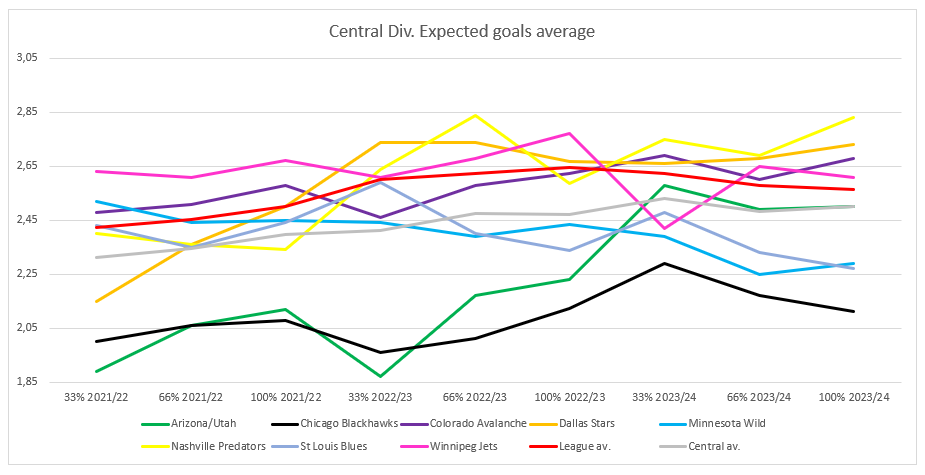 Expected goalsPraktycznie cała dywizja „porusza się” w kanale wyznaczonym przez średnią ligową (ta już wyraźnie wyższa) a dywizyjną. In plus wyróżniają się Predators, którzy są dłuższymi okresami powyżej ligowej przeciętnej, sezon 2024 to generalnie czas nadrabiania przez czołówkę dywizji (Stars, Preds, Avalanche i Jets) do uciekającej ofensywnie ligi, stymulowanym długiem wyścigiem o zwycięstwo w Central i fenomenalnym runem Preds pod koniec zeszłego sezonu.