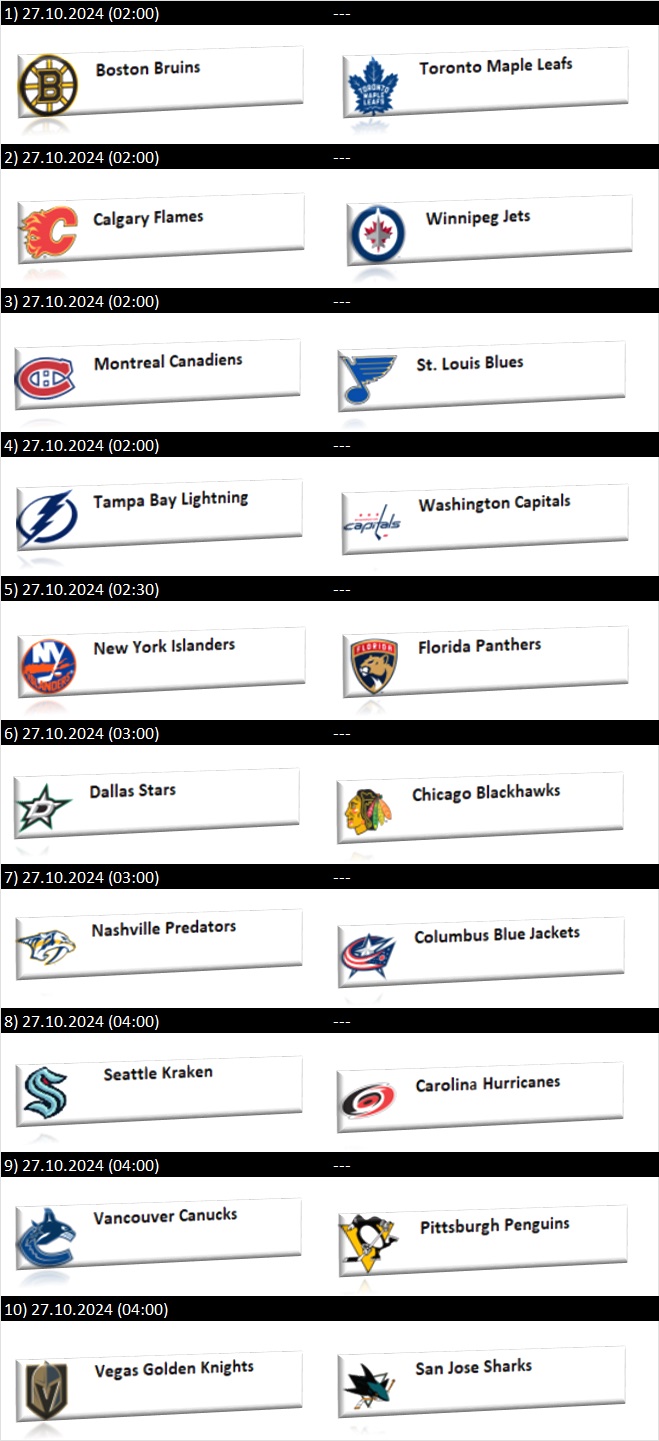 Boston Bruins -Toronto Maple Leafs x o( joker 3-3). Calgary Flames -Winnipeg Jets 2 o. Montreal Canadiens -St .Louis Blues 2 o. New York Islanders – Florida Panthers 2 u. Dallas Stars – Chicago.Blackhawks – 1 o. Nashville Predators – Columbus Blue Jackets 1 o Seattle Kraken. -Carolina Hurricanes 2 o Vancouver Canucks – Pittsburgh Penguins 1 o Vegas GK – San Jose Sharks 1 o