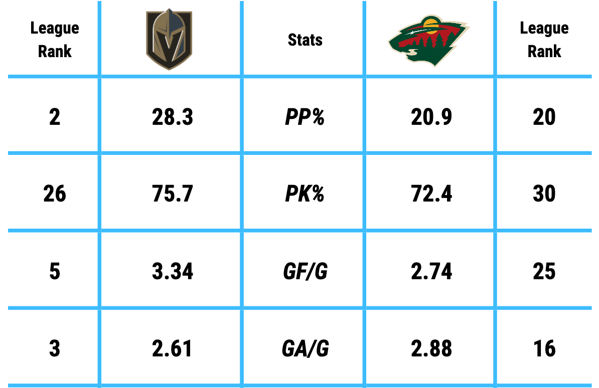 Minnesota z kolei, po świetnym początku sezonu, musiała walczyć do ostatniego meczu o miejsce w play-offach, głównie z powodu kontuzji kluczowych zawodników. Zakończyli sezon z bilansem 45-30-7 (97 punktów). Obie drużyny mają już historię w play-offach – w 2021 roku Vegas pokonał Minnesotę w siedmiu meczach. W tym sezonie Golden Knights zdominowali serię wewnątrz rundy regularnej, wygrywając wszystkie trzy spotkania.