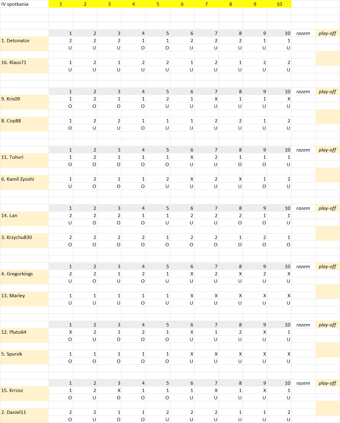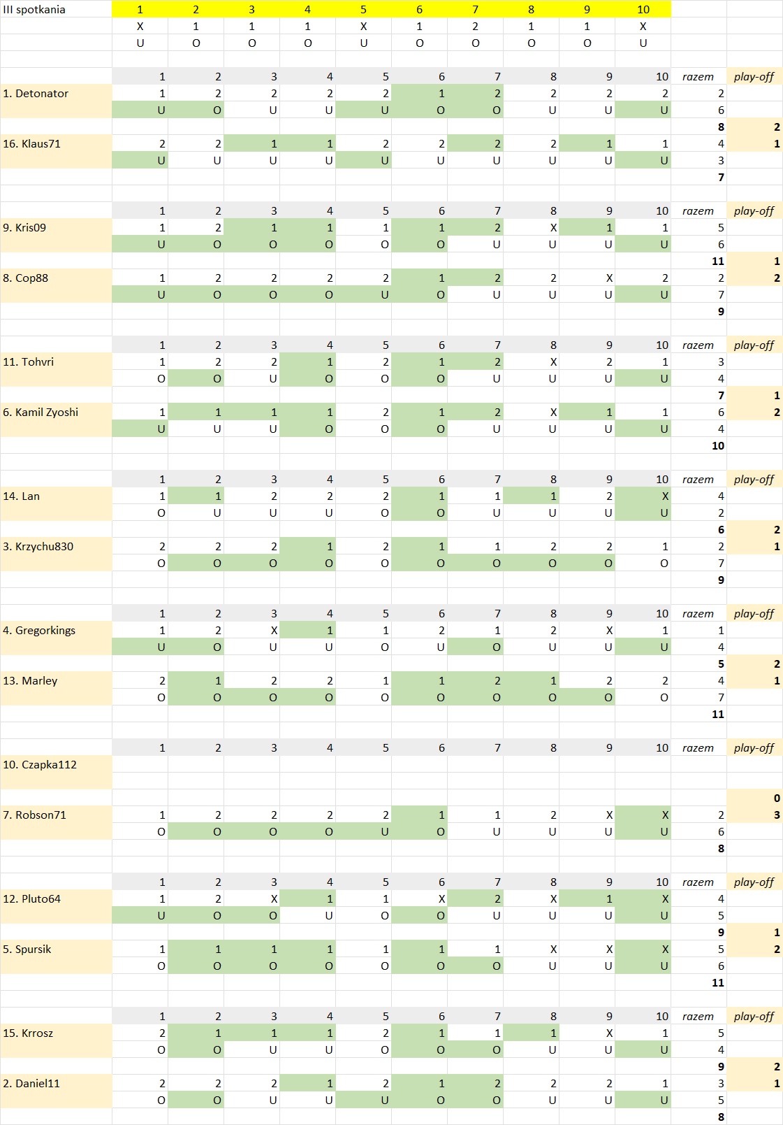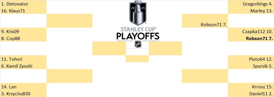 Zgodnie z punktem regulaminu swoje typy w fazie play-off wysyłamy na adres e.mail kzyzak @ hotmail com – nie składamy typów w komentarzu jak miało to miejsce w fazie zasadniczej. W ten sposób unikamy skopiowania identycznych typów swojego rywala, zmieniając taktycznie jedno spotkanie – owe miejsca miały we wcześniejszych play-off w już praktycznie rozstrzygniętych spotkaniach.