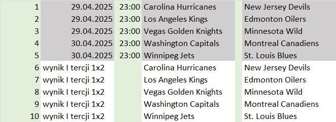 - wynik I tercji 1×2 (over/under 2.5) Vegas Golden Knights – Minnesota Wild