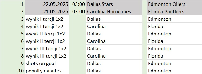 10. penalty minutes (kto więcej lub remis (1×2) – regulaminowy czas gry) Dallas – Edmonton