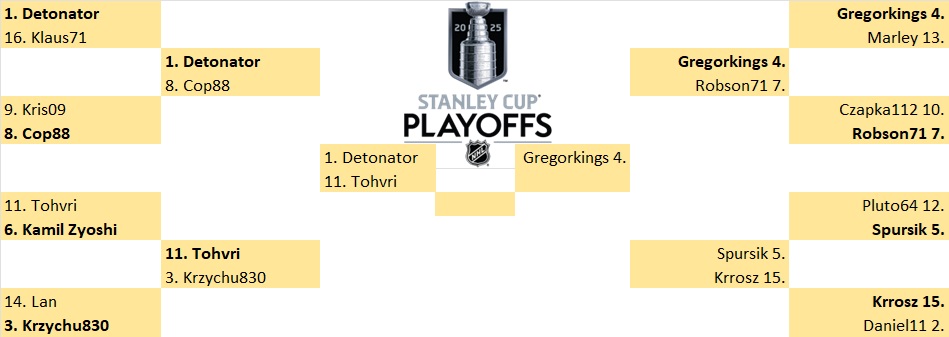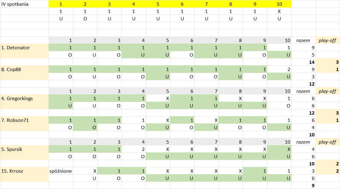 Pozostała jedna para w rywalizacji 1/4 play-off (Spursik – Krrosz). Typy im zostaną przesłane odpowiednio na e.mail. Spotkania do typowania są umieszczone w poprzednim news.