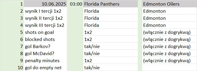 - wynik I tercji (1×2, over/under 2.5) Florida – Edmonton
