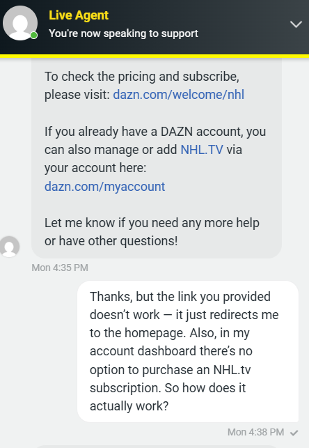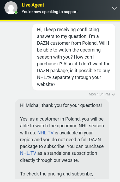 Rozmowy z obsługą klienta DAZN przynosiły sprzeczne informacje – jedni konsultanci mówili że jak najbardziej usługa jest w Polsce, a inni po zwróceniu im uwagi że niczego takiego nie ma w panelu klienta, szybko kontrowali że rzeczywiście w Polsce nie ma i nie będzie.