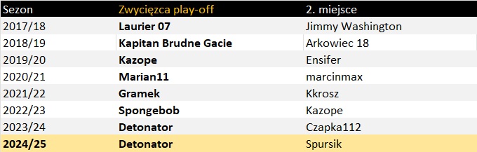 W ostatnim sezonie zwycięzcą rundy zasadniczej był Detonator. Triumfatorem play-off został także Detonator zdobywając dwukrotnie pod rząd trofeum play-off! W finale pokonał Spursika.
