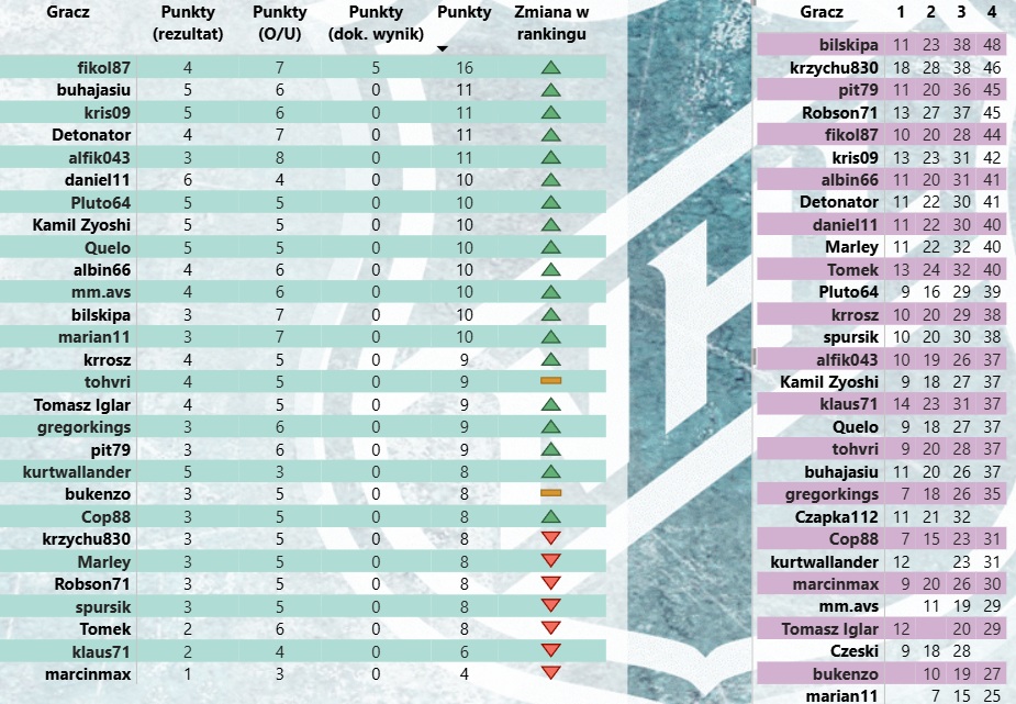 W pierwszej kolejce listopada najskuteczniejszy zostaje Fikol87 notując 16-ście oczek. Pięć punktów zalicza w meczu Buffalo Sabres – Washington Capitals (3:3). Na pozycji lidera w generalnym zestawieniu jest Bilskipa.