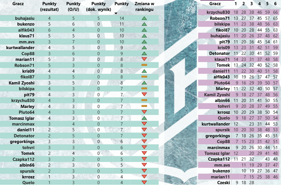 Buhajasiu z trafionym prawidłowym rezultatem meczu Carolina Hurricanes 3:3 Edmonton Oilers zbiera najwięcej oczek w 3 kolejce listopada. Na pozycji lidera całego zestawienia typera lideruje Krzychu830.
