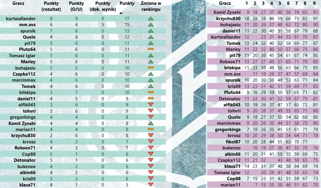 Typer Kurtwallander wysoko punktuje w pierwszej kolejce grudnia. Gracz zdobywa 17-ście oczek (bez trafienia jokera), imponujący wynik 8 trafionych spotkań w systemie 1×2 oraz 9 w over/under. Jokera trafiła mm.avs w meczu Ottawa Senators – St. Louis Blues 1:2 dając pozycje numer dwa weekendowej kolejki.