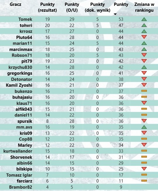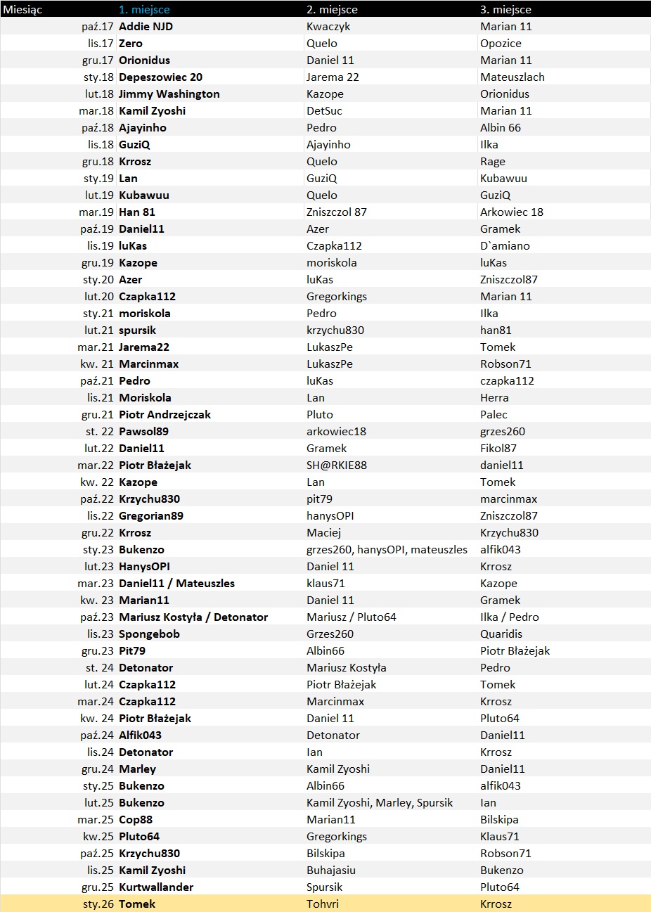 Nie tylko zwycięzca 4 kolejki stycznia, a także zwycięstwo w miesiącu – Tomek z dorobkiem 53 trafień wygrywa pierwszy miesiąc tego roku. Tomek wcześniej trzykrotnie wpisywał się na zestawienia top3 miesiąca, aczkolwiek zawsze były to lokaty numer trzy. Druga lokata identycznie z weekendowego rozegrania wędruje do Tohvri. Dla tohvriego jest to pierwszy wpis od roku 2017 w najlepsze zestawienie miesiąca. Na pozycję numer trzy wędruje Krrosz, a ten już pięciokrotnie w historii widniał na liście wszechczasów (dwukrotnie wygrywając) – pełne zestawienie poniżej.