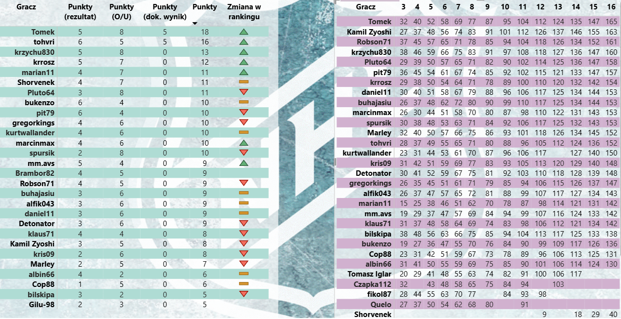 Ostatnia kolejka w styczniu zamknięta z najwyższym trafieniem przez typera Tomek. 18-ście oczek w tym trafiony Joker w meczu Minnesota Wild 3:3 Florida Panthers winduje typera nadto na pozycję lidera w rundzie zasadniczej. Druga pozycja dla Tohvri z 16-stoma trafieniami – ten także trafia prawidłowy wynik Joker w meczu Minnesota, gratulacje.