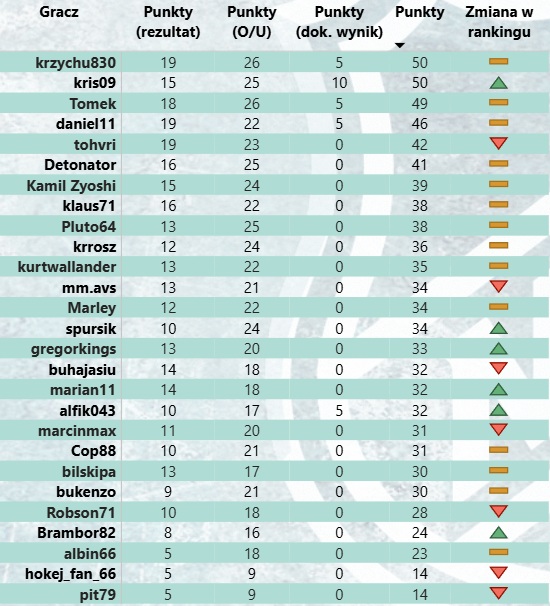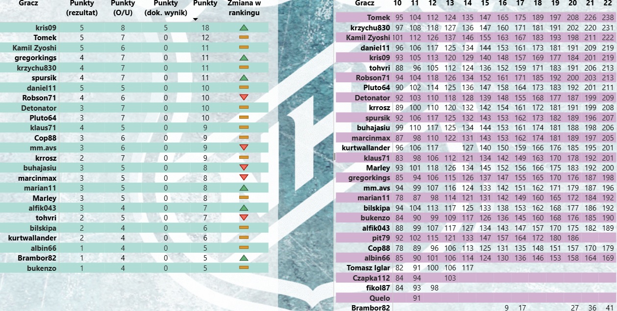Kris09 zamyka marcową kolejkę z 18-stoma oczkami. Typer dorzucił trafionego Jokera w meczu Buffalo Sabres – Seattle Kraken (2:5). W klasyfikacji generalnej Kris09 zajmuje 5 lokatę 219 punktami, a liderem pozostaje Tomek, który w tej kolejce zanotował wysoką drugą lokatę.