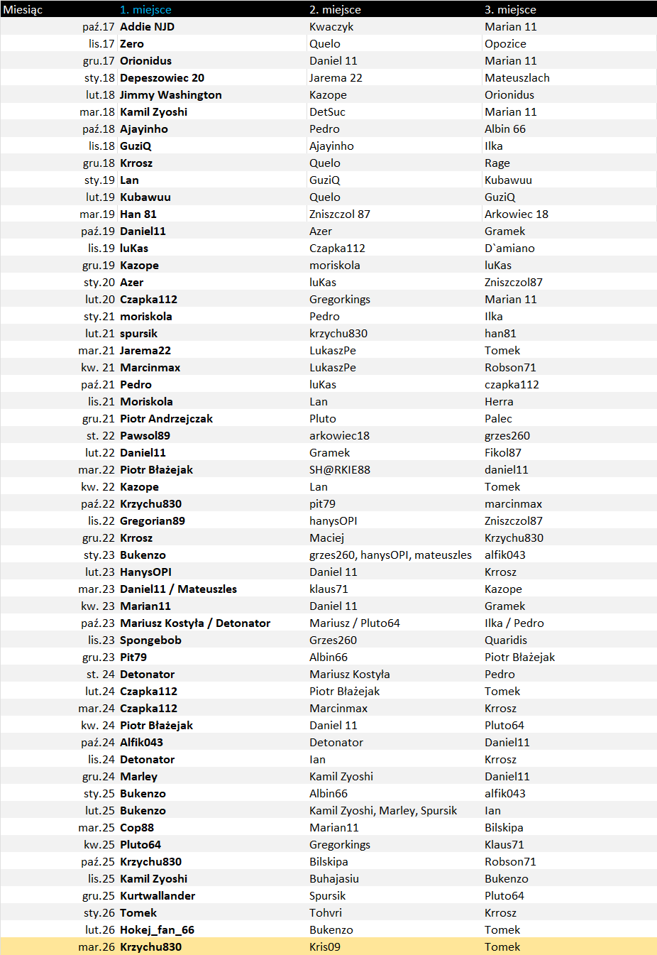 Blisko zwycięstwa był sam Kris09, który w tym miesiącu trafił dwukrotnie Jokera! Identyczna liczba punktów z Krzychu830 i słabszy bilans w spotkaniach 1×2 sprawia, że klasyfikuje się na drugiej pozycji. Krzychu830 notuje swój udział po raz piąty w historii typera na pudle pośród najlepszych w miesiącu. Wygrywał trzykrotnie – ostatni raz w październiku ubiegłego roku. Dla Krisa jest to pierwszy raz w historii mogąc znaleźć się w top3. Trzeci Tomek notuje po raz kolejny trzecią lokatę miesiąc po miesiącu z lutego na marzec. Jest to jego szósty skok do najlepszej trójki i uwaga po raz trzeci z rzędu od stycznia przez luty po obecny marzec! Zestawienie poniżej.