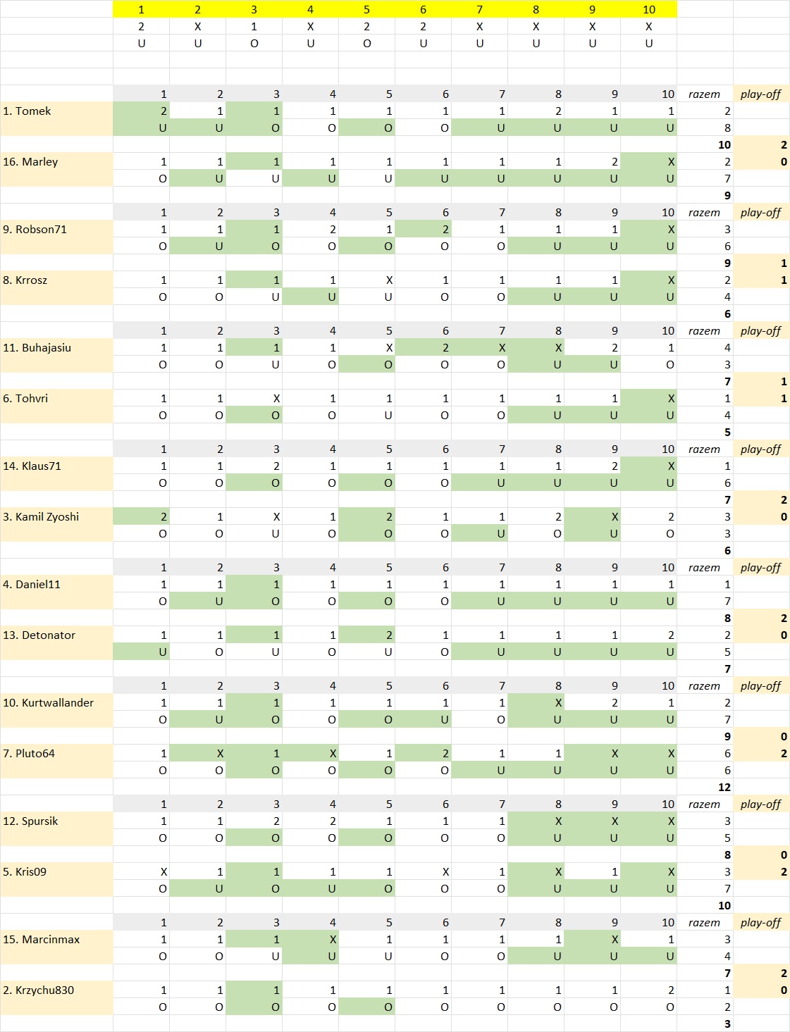 Zgodnie z punktem regulaminu swoje typy w fazie play-off wysyłamy na adres e.mail kzyzak @ hotmail com – nie składamy typów w komentarzu jak miało to miejsce w fazie zasadniczej. W ten sposób unikamy skopiowania identycznych typów swojego rywala, zmieniając taktycznie jedno spotkanie – owe miejsca miały we wcześniejszych play-off w już praktycznie rozstrzygniętych spotkaniach.