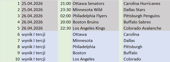 10. wynik I tercji 1×2 (over/under 2.5) Los Angeles – Colorado